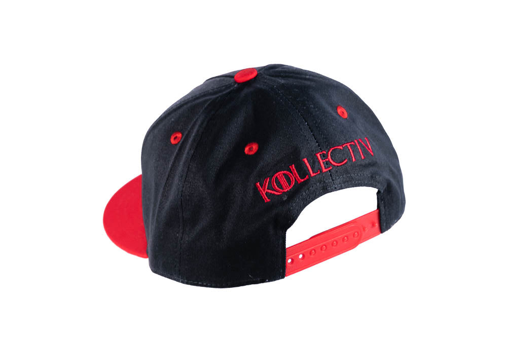 Looking for the perfect hat to level up your style? Check out the Kollectiv Apparel Black Hat with a striking red peak and bold red lettering!